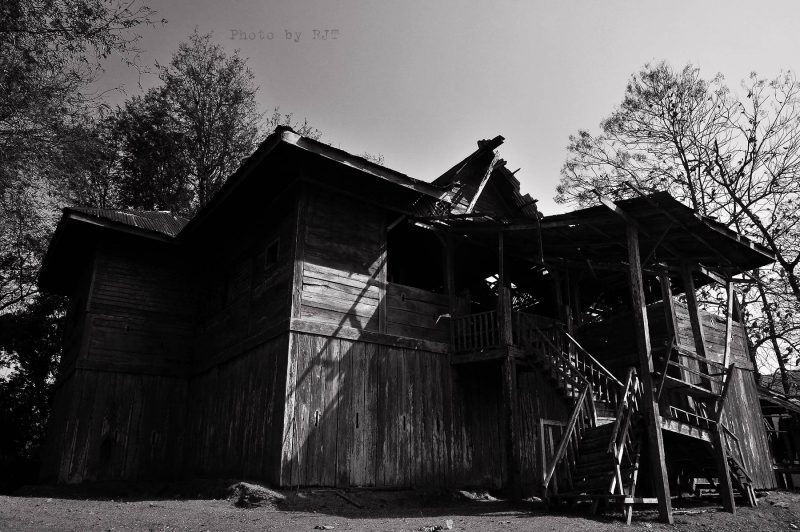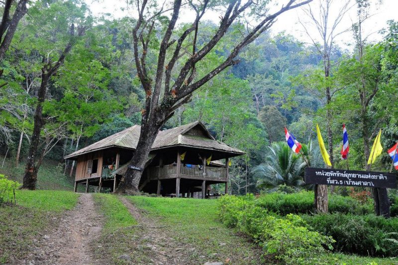 เราวิ่งขึ้นเนินยาวๆ ราวๆ 2-3 กิโลเมตร จากนั้นก็วิ่งขึ้นๆ ลงๆ ในเส้นทางบนยอดเขา กว่าจะถึง 3 แยกไปบ้านป่าเหว ใช้เวลาวิ่งไปราวๆ 30 นาที กับระยะทางประมาณ 15 กิโลเมตร ครั้งนี้ฝุ่นเป็นอุปสรรคจริงๆ เพราะต้องทิ้งช่วงขบวนรถ เพราะรถคันข้างหลังมองไม่เห็นถนน ซึ่งอาจจะเป็นอันตรายได้หากขับแบบขบวนติดๆ กัน สักพักเราวิ่งจากแยกบ้านป่าเหว เราก็มาถึงหน่วยพิทักษ์อุทยานแห่งชาติสาละวิน(บ้านศาลา) และสถานที่แห่งนี้ก็คือ สำนักเก่าของบริษัท บอมเบย์ เบอร์ม่า หรือบางทีชาวบ้านแถวนั้นเรียกว่าบ้านผีสิงกลางป่าสาละวินในตำนาน เพราะอดีตสถานที่แห่งนี้คือ ศูนย์อพยพแม่กองคา มีผู้เสียชีวิตจากโรคติดต่อ อหิวา ทั้งไข้ป่า ทั้งจากการสู้รบ สถานที่แห่งนี้จึงขึ้นชื่อว่าเฮี้ยนในระดับหนึ่ง ด้านหลังบ้านหลังนี้คือ ป่าช้าหลุมศพ เหล่าชาวกระเหรี่ยงที่ฝังอยู่ใต้ดินแห่งนี้ เท่าที่ผมทราบมาคร่าวๆ ประมาณ 200-300 ศพ เรียกความสยองยามค่ำคืนได้ไม่น้อยเลยทีเดียว หากใครจะไปนอนพักค้างคืนก็เชิญได้นะครับ เพราะผมเองคงจะขอไปนอนที่หน่วยท่าตาฝั่งละกัน