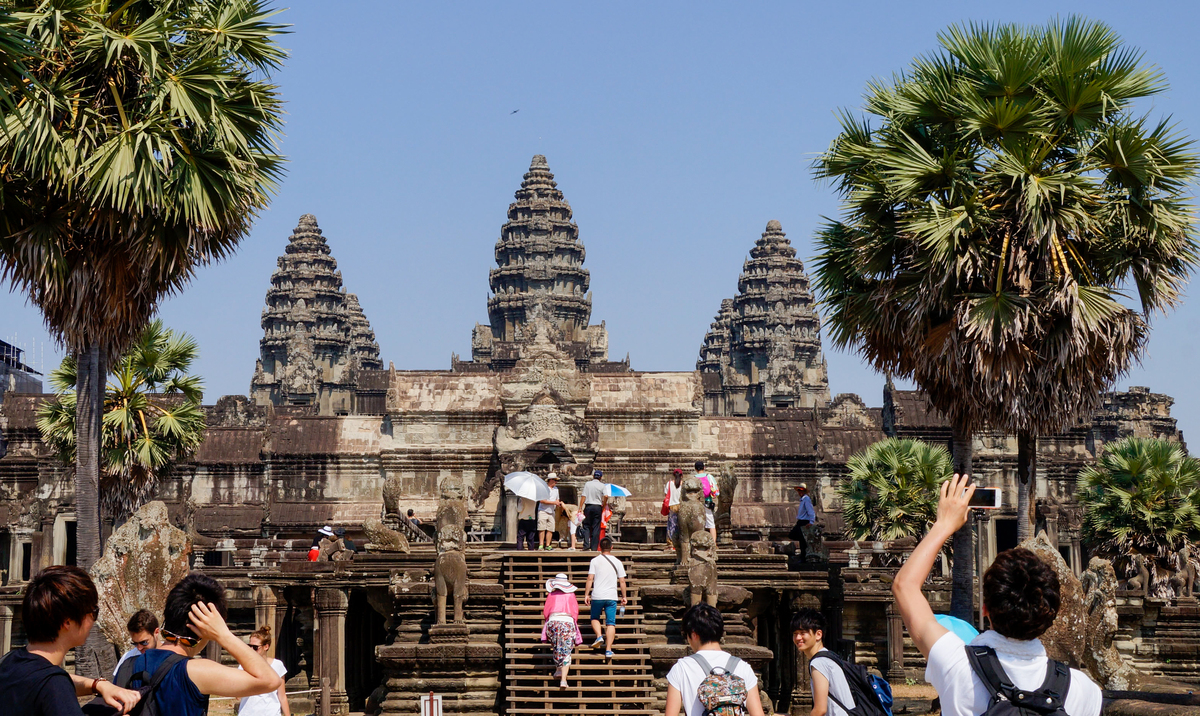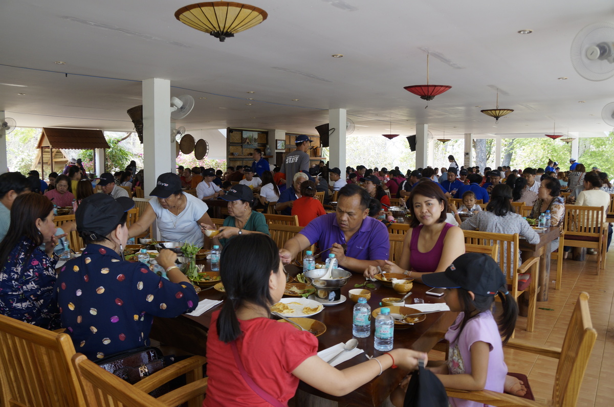 เวลาประมาณบ่ายโมง รับประทานอาหารบุฟเฟ่อเร็ดอร่อยปากที่ภัตตาคารโตนเลสาป หลังจากนั้นเดินทางท่องเที่ยวนครวัดหรืออังกอร์วัด(Angkor Wat) สิ่งมหัศจรรย์ 1 ใน 7 ของโลกยุคโบราณ และได้รับการประกาศเป็นมรดกโลกในยุคปัจจุบัน นครวัดเป็นสิ่งก่อสร้างทางศาสนาที่มีขนาดใหญ่ที่สุดของโลก ส่วนใหญ่เป็นหินทราย ตัวเทวสถานถือเป็นที่สุดของสถาปัตยกรรมเขมรสมัยคลาสสิกรุ่งเรือง และเป็นสัญลักษณ์ของประเทศกัมพูชา มีรูปนครวัดอยู่ในธงชาติ สร้างในรัชสมัยของพระเจ้าสุริยวรมันที่ 2 ในช่วงต้นคริสต์ศตวรรษที่ 12 โดยเป็นศาสนสถานประจำพระนครของพระองค์ เดิมนครวัดเป็นเทวสถานของศาสนาฮินดู ก่อนที่จะเปลี่ยนเป็นศาสนาพุทธ บนกำแพงมีงานแกะสลักเกี่ยวกับพระราชกรณียกิจของพระเจ้าสุริยวรมันที่ 2 เรื่องราวจากวรรณคดีเรื่อง รามายณะ  และยังมีรูปแกะสลักนางอัปสรมากมาย ที่ทั้งหมดมีเครื่องแต่งกายและทรงผมไม่ซ้ำกันเลย ชาวคาราวานโตโยต้าสปป.ลาวหลายคน ได้สนุกสนานผจญภัยปีนขึ้นบันไดและลงบันไดหอกลุ่มปราสาทศูนย์กลางจักรวาล สูงชันมากประมาณ 50 องศา ยาวประมาณ 60 ได้ชมวิวทิวทัศน์สวยมุมสูงกว้างสุดสายตาและสัมผัสผัสความเชื่อ ได้ขึ้นมาถึงสรวงสรรค์สมใจปราถนาที่ดั้นด้นเดินทางไกลข้ามประเทศ ลุยฝ่าฝุ่นแสงแดดแผดร้อนจัดมากๆมาเที่ยวชมนครวัด ซึ่งอลังการณ์ยิ่งใหญ่มีมนต์ขลังสมคำร่ำลือ และชวนให้นึกถึงชาวกัมพูชาโบราณสุดยอดผู้สร้างนครวัด-นครธม อัจริยะฉลาดลึกล้ำ ไม่แพ้ชาติใดๆในโลกนี้