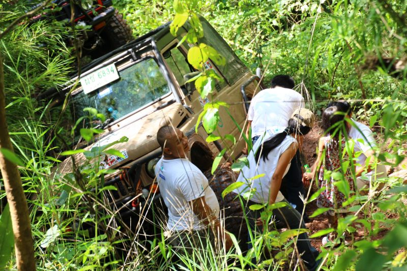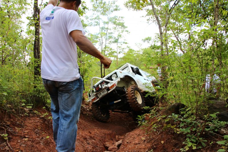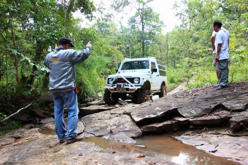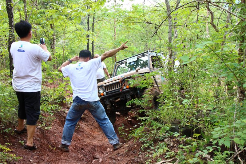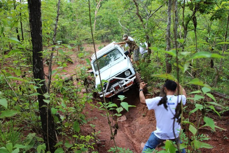 ผืนป่าแห่งนี้ เป็นเขตป่าชุมชนที่นับว่าอุดมสมบูรณ์มากพอสมควร เพราะจะเห็นแต่การเลี้ยงสัตว์ของชาวบ้านเท่านั้นที่ใช้บริการป่าผืนนี้ การบุกรุกทำกินลึกเข้าไปในป่าไม่ค่อยเห็น นับเป็นการทำงานของเจ้าหน้าที่ที่น่ายกย่อง  เราใช้เวลาเดินทางตามร่องเขา สูงบ้าง ต่ำบ้าง หลบต้นไม้ ก้อนหินเล็กใหญ่ กว่า 2 ชั่วโมง ก็มาถึงสะพานหินที่คอยดักล้อขนาด 35 นิ้วไว้อยู่หมัด ต้องออกกำลังกันอีกครั้ง  และ…รอดทุกคัน!!  ค่อย มุดป่า คล่อมตอ หินลอยเป็นช่วงๆ กว่า 1 ชั่วโมง ความเหนื่อยล้าจากการเดินทางมาจากบ้านเมื่อเช้า เล่นเอาผมง่วงมาทันที ยังดีที่มี  อ้ายอึ่ง จาก สปป.ลาว ดีกรีผ่านสังเวียน  RFC 2014 ที่เวียดนามมาหมาดๆ นั่งเป็น  Co-Driver ให้