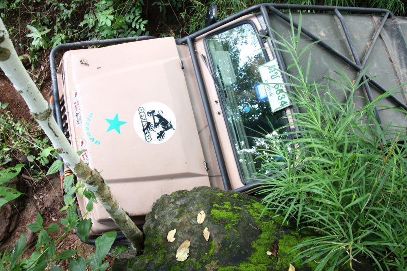 …เราหยุดรถ 4WD ไว้ เพื่อสำรวจร่องทางที่หายไป กลายเป็นอุโมงค์ โพรงหญ้า และร่องตัว V ต้องขนาดเท่าร่างแมงหวี่จะผ่านได้  นี่หรือเป็นที่มาของ “ช่องแคบมะละกา”  คันแรก เฮียอ๊อด กระทิงดง มือเก๋าแห่งเมืองอุดรฯ ขอลองก่อน มิวายต้องลงแส้ ม้าขาวให้ทะยาน ครั้งแล้ว ครั้งเล่า เหาะกี่ครั้งก็ไม่ไหว ทั้งโหน ทั้งลากทั้งเบียด ต้องวินช์ช่วย จนผ่านอุปสรรคไปได้ ท่ากลางเสียงภาวนา และให้กำลังใจจากเพื่อนๆว่า “คว่ำๆๆๆๆ”