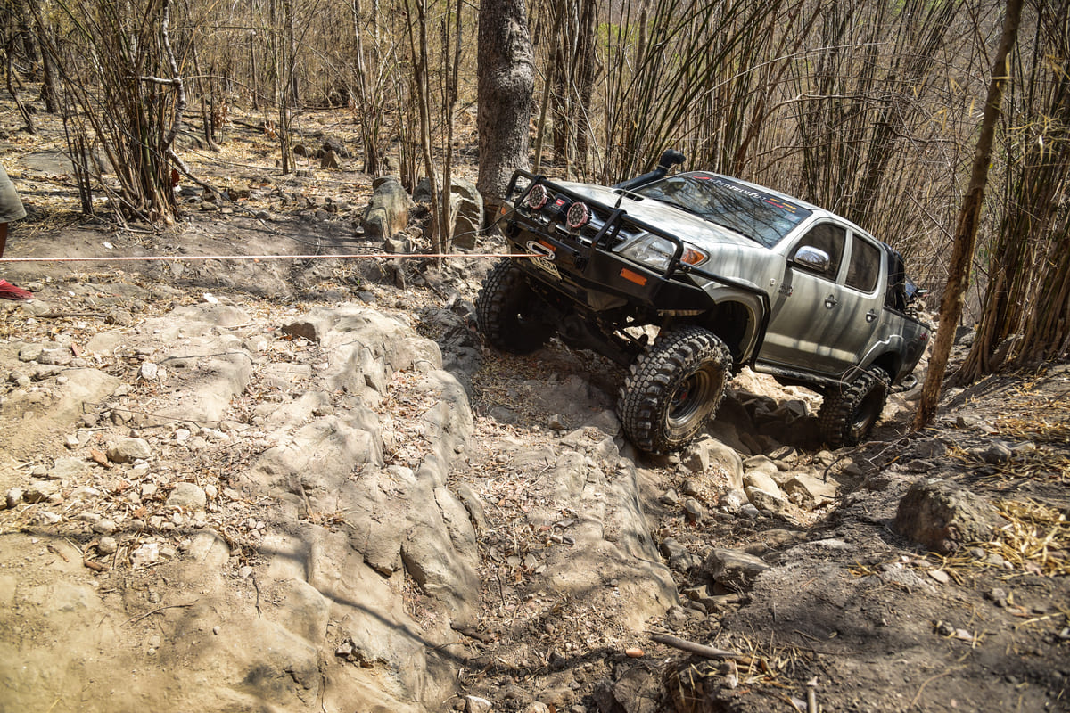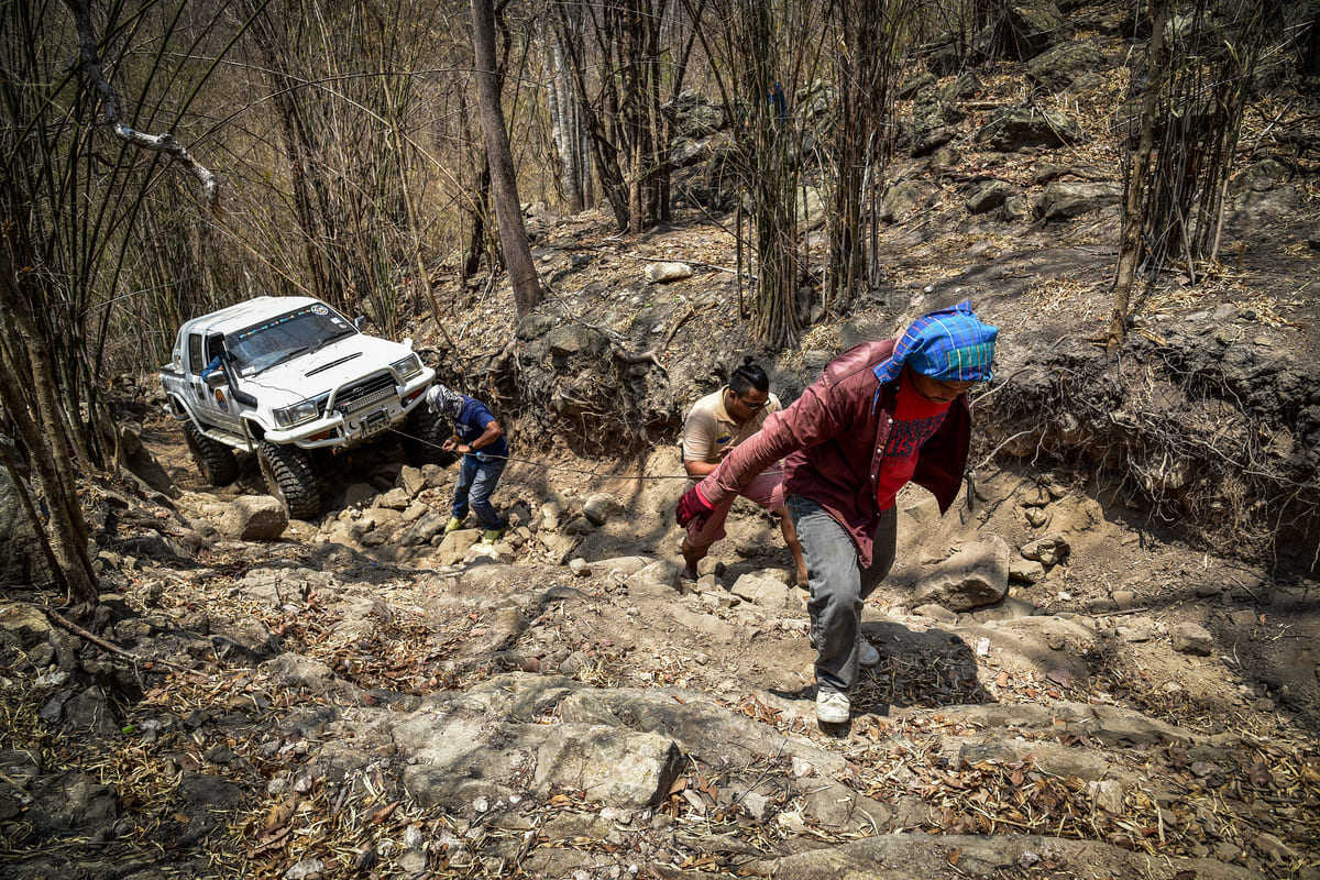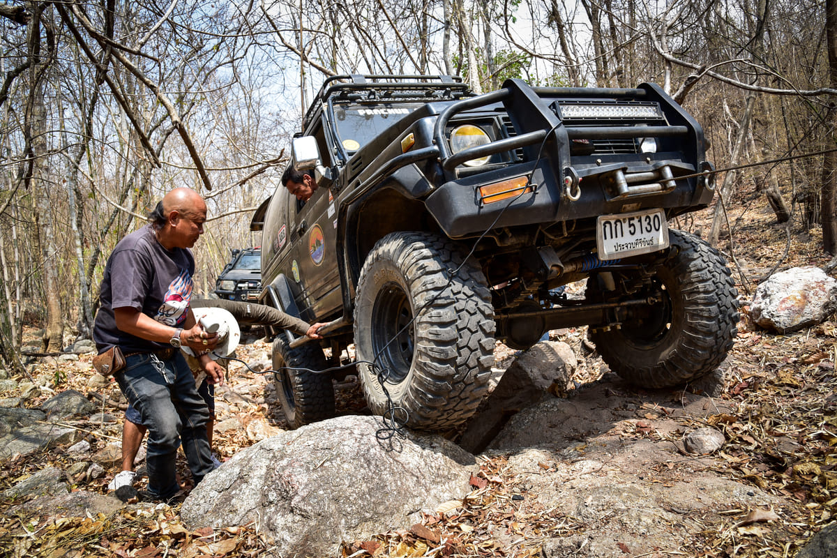 เส้นทางจะไต่ความสูงขึ้นไปแบบเรื่อยๆ สลับกับลำห้วยในบางช่วงที่บัดนี้แห้งผากไม่เหลือเค้าของต้นน้ำสายสำคัญที่ไหลลงอ่างเก็บน้ำต่างๆ ด้านล่าง เส้นนี้ในช่วงฤดูแล้งนี้ ถือได้ว่าไม่ยากแต่ก็ไม่ง่ายเท่าไรนัก แต่ต้องอาศัยทักษะการขับขี่ รวมทั้งรถต้องมีความพร้อมพอสมควร มีจุดไฮไลท์ที่ต้องใช้ทักษะอยู่ประมาณ 2-3 แห่ง จุดแรกเป็นเนินหินและร่องลึกสลับซ้าย-ขวา จะอยู่ในช่วงต้นๆ ทาง และจุดนี้ก็สร้างปัญหาให้กับรถเสียหายไป 2 คัน ต้องจอดแอบเอาไว้ข้างทาง ส่วนจุดที่สองนี่หนักถือว่าค่อนข้างหนักพอสมควร เป็นบันไดหินที่ยาวเกือบๆ 50 เมตร ที่เกิดจากการถูกน้ำกัดเซาะจนกลายเป็นขั้นบันได ต้องใช้วินช์ช่วยแทบทุกคัน และจุดนี้ก็ทำให้รถอีก 2 คัน ต้องสังเวยยาง เพลากลาง เพลาข้าง และเฟืองแตก จอดแอบข้างทางตามระเบียบ