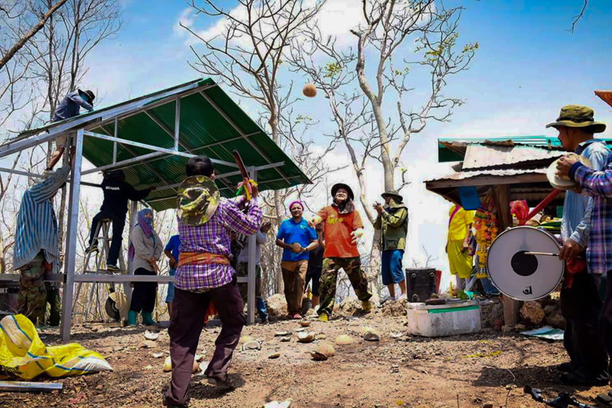 อย่างไรก็ตามเราใช้เวลาเดินทางเกือบๆ 7 ชั่วโมง เดินทางผ่านยอดเขาบริวารทั้งหมด 3 ลูก ผ่านเนินชันและโขดหินน้อยใหญ่มากมาย จนแทบไม่มีเวลาหายใจหายคอกันเลยทีเดียว กระทั่งบ่ายคล้อยก็เดินทางถึงสันเขาแด่นด้านบน สิ้นสุดเส้นทางที่รถสามารถขับต่อไปได้ ต่างคนต่างสาละวนขนของขึ้นไปบนยอดจุดสูงสุดอีกราว 80 เมตร ที่ตั้งของศาลพ่อปู่เขาแด่น หรือบางคนเรียกยอดเขาพีรามิด เพื่อเร่งมือในการสร้างศาลและศาลาพักแห่งใหม่ ให้ทันกับพิธีกรรมในการยกศาลพ่อปู่เขาแด่นก่อนเที่ยงวันพรุ่งนี้