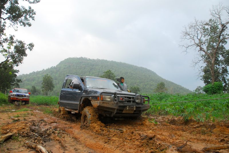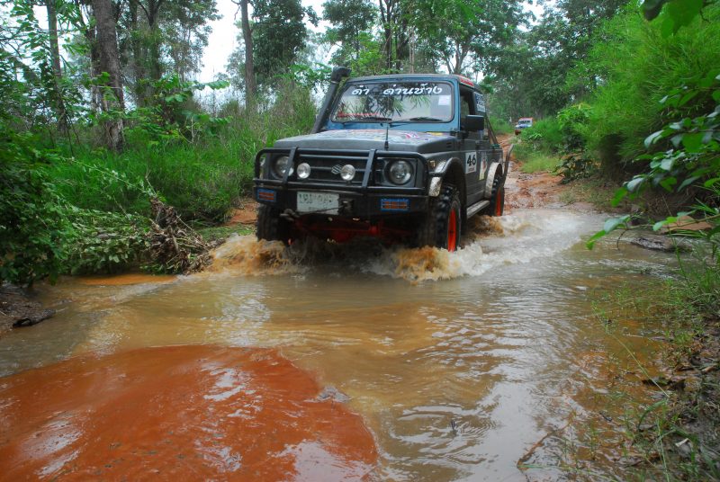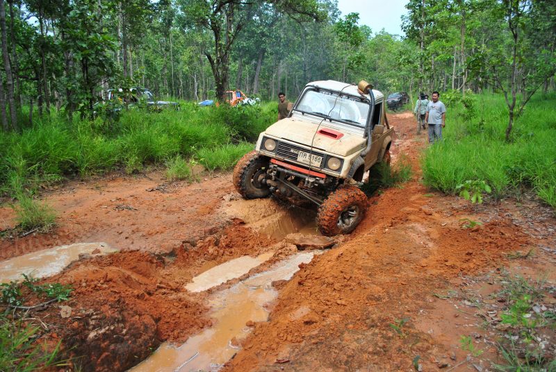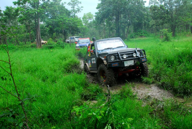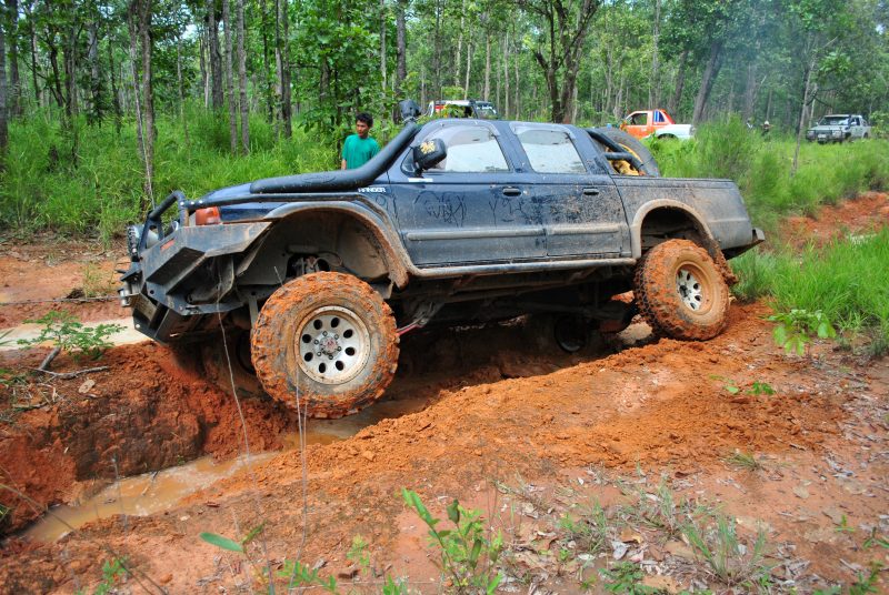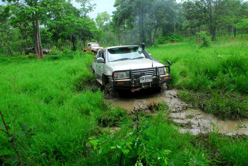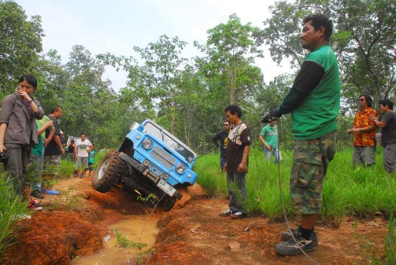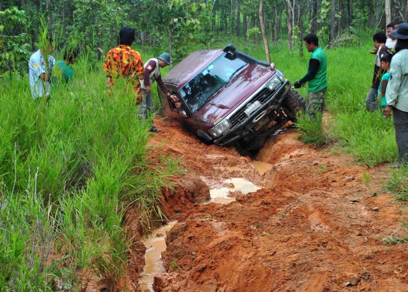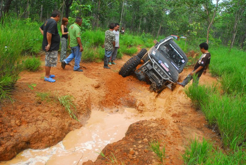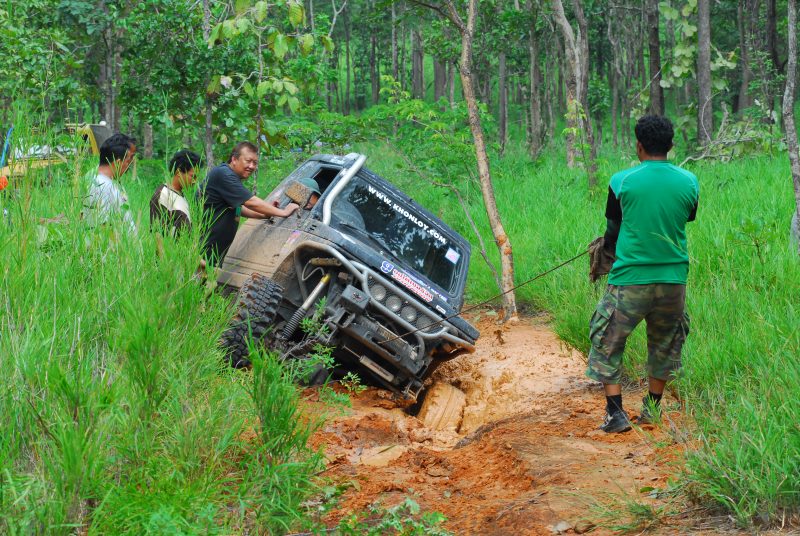 สภาพเส้นทางถือว่าไม่ยากเท่าไร เป็นทางดินแดง สลับกับทางหิน จุดไหนยากหรือไม่ต้องการเสียเวลา ก็สามารถเบี่ยงซ้าย-ขวา หลบได้ตลอด ผ่าน 10 กิโลเมตรไปแล้วนั่นแหละครับ เราจึงได้พบกับอุปสรรคใหญ่จุดแรก เส้นทางถูกน้ำแทงขาดจนกลายเป็นร่องลึก ยาวประมาณ 20 เมตร ร่องนั้นกว้างพอดีกับฐานล้อ จะขับคร่อมก็เสี่ยงหลุดไลน์ เพราะฉะนั้นทุกคันต้องนำล้อรถลงร่องข้างหนึ่ง จะซ้ายหรือขวาก็ได้ และขับแบบตะแคงข้าง ส่วนใหญ่ไปไม่ถึงไหน ก็เกิดอาการแขวนท้อง สุดท้ายต้องใช้วินช์ช่วย เราใช้เวลาอยู่ในจุดนี้พักใหญ่ จึงผ่านมาได้ทั้งขบวน จากจุดแรกมาไม่ถึงหนึ่งกิโลเมตร ก็ต้องเจอกับบ่อโคลนยาวที่แอบซ่อนอยู่กลางทุ่งหญ้า แต่ก็ไม่สร้างปัญหาให้กับขบวนของเราเท่าไรนัก