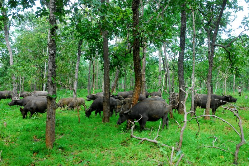 เมื่อเข้าสู่ราวป่า ทุกคันก็เริ่มปรับตำแหน่งเกียร์จากขับเคลื่อนสองล้อ เป็นสี่ล้อแบบ 4L เนื่องจากเริ่มมีอุปสรรคให้ได้แตะคันเร่งกันเพิ่ม ยิ่งลึกเส้นทางยิ่งซอกแซก เส้นทางค่อยๆ ไต่ความสูงขึ้นไปเรื่อยๆ แบบไม่รู้ตัว ป่าเริ่มหนาตาด้วยไม้เต็ง ไม้รัง พลวง ไผ่เพ็ก โจด มหาก่าน ปอเต่าไห้ ส้มกั้ง ส้านดิน เปราะป่า นางอั้ว ไก่อู้ แต่ก็ไม่รกทึบเหมือนป่าดิบชื้นหรือดงดิบ มีพืชล้มลุกและหญ้าอีกหลายชนิดขึ้นซอนแซมอยู่ทั่วไป เป็นธรรมชาติของป่าภาคอีสาน ซึ่งจะว่าไปแล้วเส้นทางที่เราเดินทางไปนี้ ไม่มีแหล่งท่องเที่ยวสำคัญอะไรมากมาย แต่มันถูกทดแทนด้วยธรรมชาติที่สงบเงียบ เหมาะสำหรับผู้ที่ศรัทธาในคุณค่าของป่าเขา และสวรรค์ของชาวบ้านที่หาเห็ดระโงก ซึ่งกำลังออกดอกออกผลพอดี เราจึงพบชาวบ้านออกหาเห็ดระโงกอยู่เกือบตลอดเส้นทาง เห็ดระโงกนั้นชาวบ้านที่นี้เรียกกันว่า เห็ดไข่เป็ด (ชื่อทางวิทยาศาสตร์ว่า Amanita vaginata) ลักษณะมีทั้งสีขาว สีแดง และสีเหลือง ดอกตูมกลีบรี คล้ายไข่ห่าน เมื่อโตขึ้นหมวกและก้านดอกจะดันปลอกหุ้มแตกออกมา สปอร์และครีบสีขาว ดอกเห็ดมีลักษณะเป็นเมือก ขอบหมวกมีร่องเล็กๆ ตรงกันกับครีบ คนอีสานมักนำไปห่อหมก แกงเห็ดระโงก หรือแกงเห็ดระโงกใส่มะขาม มีสรรพคุณทางยาช่วยหยุดยั้งการเติบโตของเนื้อร้ายหรือเซลล์มะเร็ง