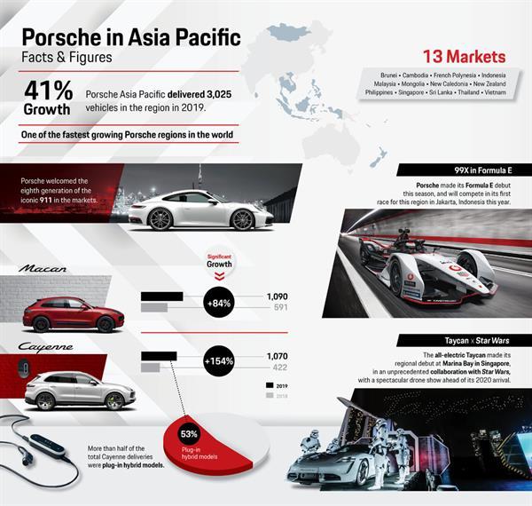 – ปอร์เช่ เอเชีย แปซิฟิก ปิดฉากปี 2019 ด้วยผลงานยอดขายรวม 3,025 คัน คิดเป็นอัตราการเติบโตในระดับตัวเลข 2 หลัก นับเป็นหนึ่งในภูมิภาคที่เติบโตรวดเร็วที่สุดในโลกสำหรับปอร์เช่