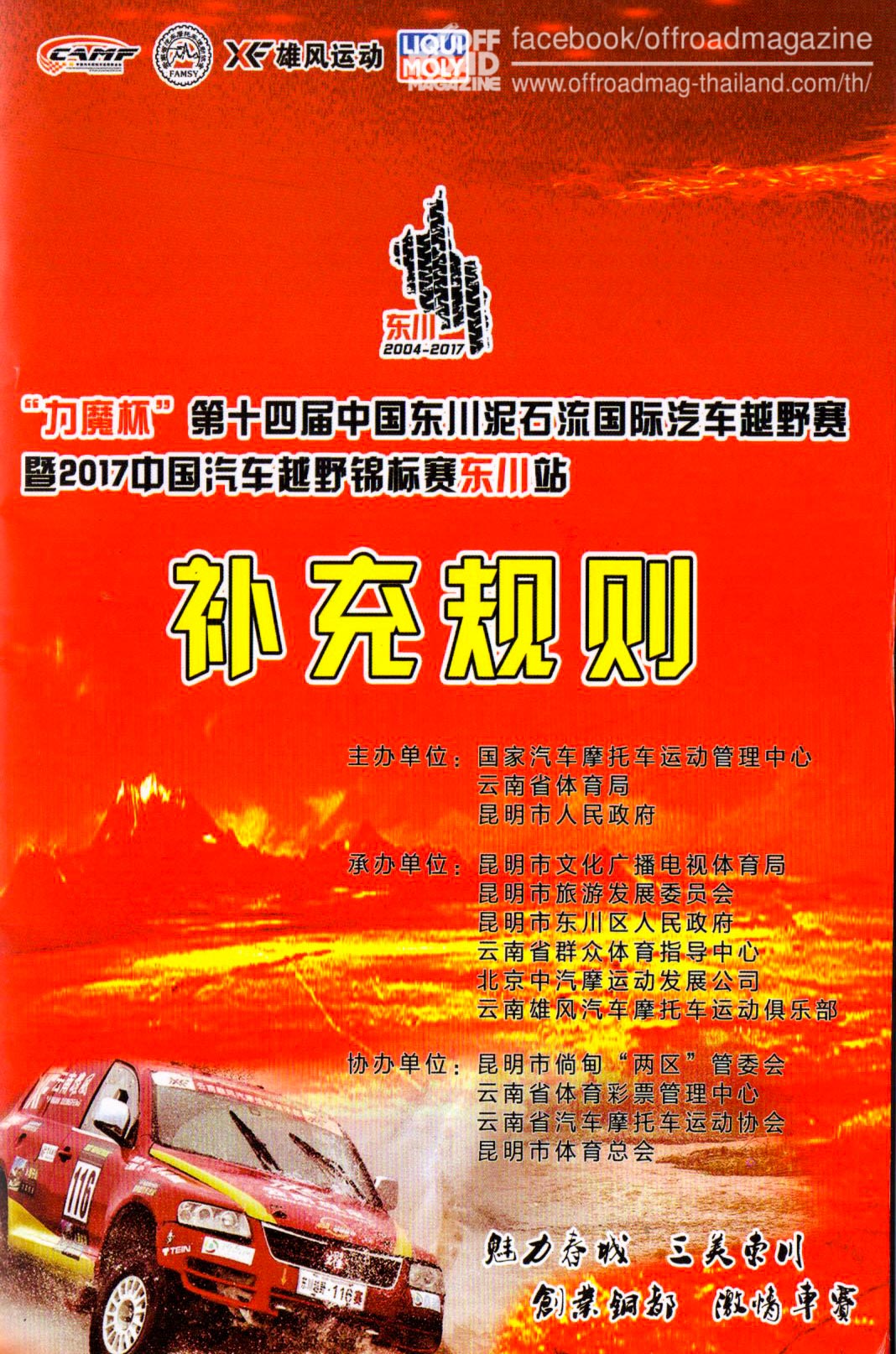 .ตงชวน จ.คุนหมิง มณฑลยูนาน ประเทศจีน นำโดย นายอำเภอผู้หญิงชื่อ Mrs Yen Jing Mayor of Dongchuan ร่วมกับ Ma Jing Kun อดีตนักแข่งขันแรลลี่คนดังของจีน และสมาพันธ์กีฬารถยนต์และมอเตอร์ไซค์แห่งมณฑลยูนาน, สมาพันธ์กีฬารถยนต์และมอเตอร์ไซค์แห่งประเทศจีน สมาคมเดอร์บริส โฟรว์ ออโต้ครอส จัดการแข่งขันสมรภูมิแข่งรถยนต์ออฟโรดพันธุ์ผสมแรลลี่กับออฟโรด เป็นครั้งที่ 14 ระหว่างวันที่ 26 เมษายน–2 พฤษภาคม 2017 บริเวณแม่น้ำเฉียวเจียง