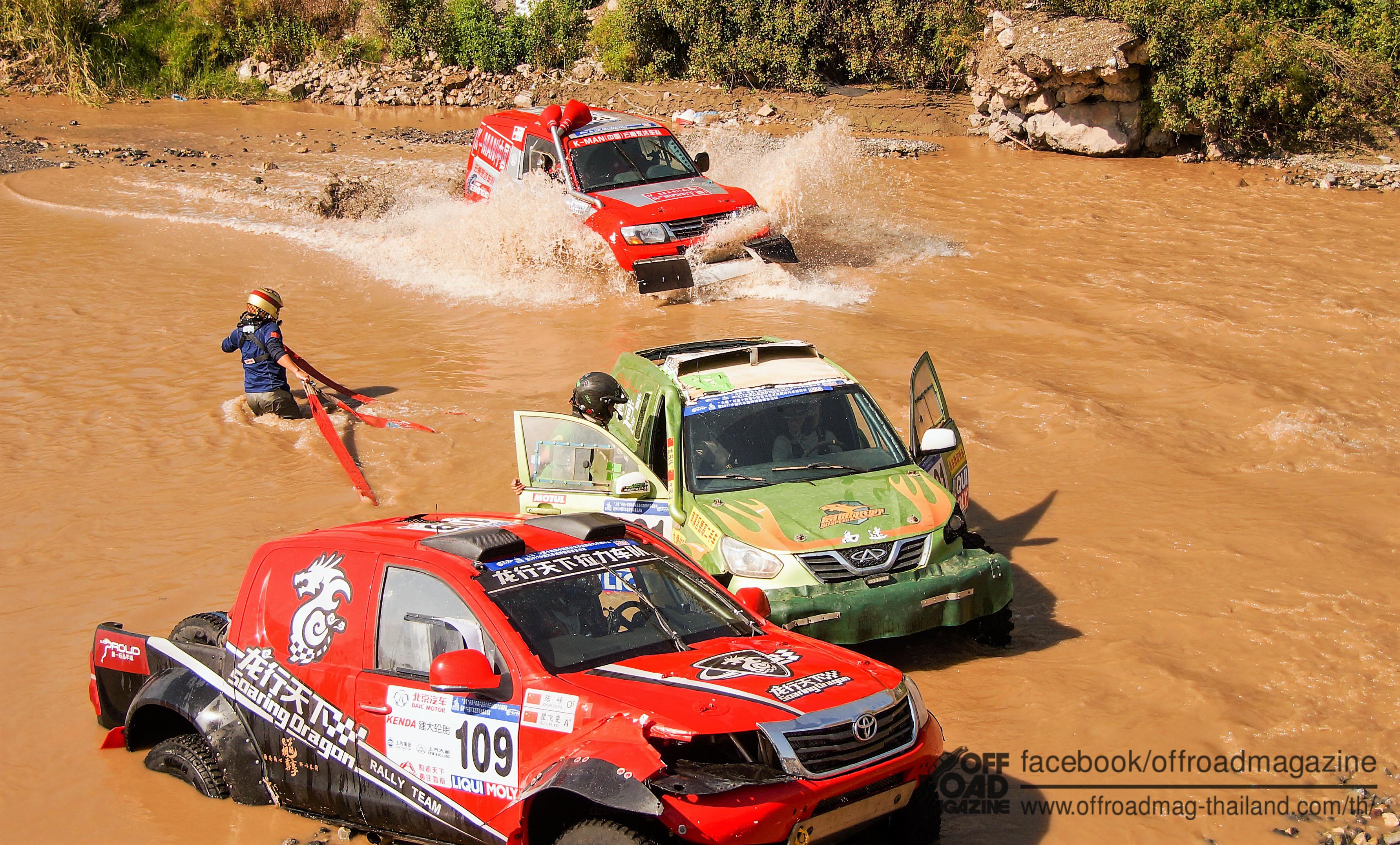 วันที่ 30 เมษายน นักแข่งต้องบุกเส้นทางออฟโรดในแม่น้ำเฉียวเจียง ที่มีน้ำมากสุดเป็นประวัติการณ์ ดังนั้นเส้นทางไปและกลับอาหวั่ง–จินหยวน SS2 , จินหยวน–อาหวั่ง SS3 รวมประมาณ 110.80 ก.ม. หลายทีมเครื่องยนต์พังเพราะน้ำรวมทั้งช่วงล่างกระจาย อย่างไรก็ตามวันที่ 1 พฤษภาคม ปัญหาฝนตกทำให้มีน้ำมากขึ้นอีก จึงมีการเปลี่ยนแปลงเส้นทางกลับมาเป็น อาหวั่ง–จินหยวน SS4 , จินหยวน–อาหวั่ง SS5 ตามเส้นทางแข่งเดิมเมื่อวานนี้  ด้วยเหตุมีน้ำลึกหลายแห่งลึกที่สุดช่วงสองกิโลเมตร บริเวณซันเจียงโข่ว ปากแม่น้ำสามสายมารวมกัน รถยนต์หลายคันเครื่องยนต์พังเพราะน้ำเข้า และบางทีมติดหล่มใต้น้ำ วันที่ 2 พฤษภาคม วันสุดท้ายของการแข่งขันช่วงเวลาเช้า แข่งขันSS6 ในเส้นทางอาหวั่ง – หลินหยุน ระยะทางประมาณ 44 ก.ม. เป็นการวัดความอึดของคนและรถยนต์แรลลี่ในเส้นทางออฟโรด ทีมใดทนทานทรหดและทำความเร็วได้ดีกว่า จึงจะยืนแป้นเป็นผู้ชนะได้สมใจ