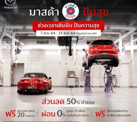 2. พิเศษสำหรับลูกค้าปัจจุบัน มาสด้าขอมอบการดูแลที่ดียิ่งขึ้นให้กับลูกค้าที่ต้องการนำรถเข้ามารับการดูแลที่ศูนย์บริการ รับข้อเสนอ ผ่อนชำระสบายๆ 0% นานสูงสุด 10 เดือน1 สำหรับสินค้าและบริการหลังการขาย, บริการตรวจเช็กสภาพรถฟรี 20 รายการ1 ทั้งระบบช่วงล่าง เครื่องยนต์ และระบบความปลอดภัย, ฟรีบริการฉีดพ่นน้ำยาฆ่าเชื้อภายในรถยนต์1 ด้วยน้ำยาฆ่าเชื้อที่ไม่ก่อให้เกิดการเสียหายต่อชิ้นส่วนอุปกรณ์ทั้งภายนอกและภายในตัวรถ และส่วนลดค่าแรง 50%4 สำหรับการเข้ารับบริการระหว่างวันจันทร์ – ศุกร์ เมื่อทำการนัดหมายเพื่อเข้ารับบริการล่วงหน้า โดยเริ่มระหว่างวันที่ 7 – 31 สิงหาคม 2564 ณ ศูนย์บริการมาตรฐานมาสด้าทั่วประเทศ