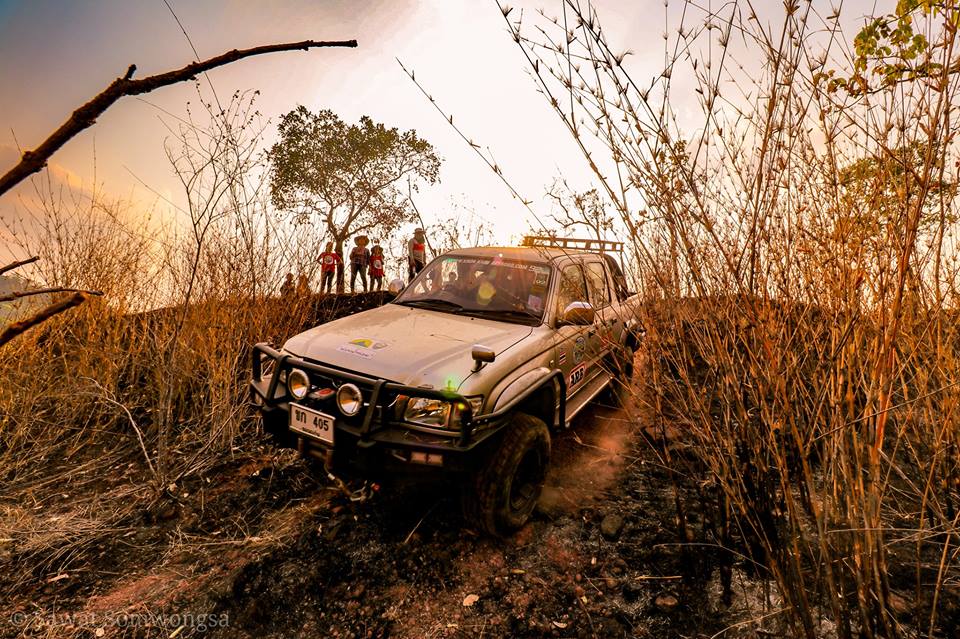 เราขับตามกันเป็นขบวนตามเส้นทางที่เริ่มไต่ระดับขึ้นเขาไปเรื่อยๆ จนเจอกับอุปสรรคแรกนั่นก็คือ ทางลงลาดชันความสูงหน้าจะอยู่ที่ประมาณสิบกว่าเมตร ความลาดชันของมันถือว่าได้ใจจริงๆ จนต้องส่งคนมากคนลงไปดูก่อน เพื่อหาผู้กล้างที่จะโรยตัวลงไปก่อน ในที่สุดโจ กระนวน กับรถคู่ใจคาริเบี้ยนคู่ใจขอลองดูนำรถเปิดทางลงไปก่อนอย่างระมัดระวังครั้นไหลลงไปได้สักพักใหญ่ รถคันเก่งก็ต้องหยุดชะงักเนื่องจากไปชนตอไม้ที่ถูกปกคลุมด้วยหญ้าที่สูง ถอยหลังก็ไม่ได้เดินหน้าก็ไม่ได้ติดอยู่กึ่งกลางเนิน ต้องให้รถอีกคันมาช่วยวิ้นช์ดึงขึ้น กระทั่งผ่านมาได้ แต่ก็ใช้เวลาไปเกือบๆ ชั่วโมง จุดนี้เองกินเวลาพวกเราไป 3-4 ชม.กับรถ 20 คัน