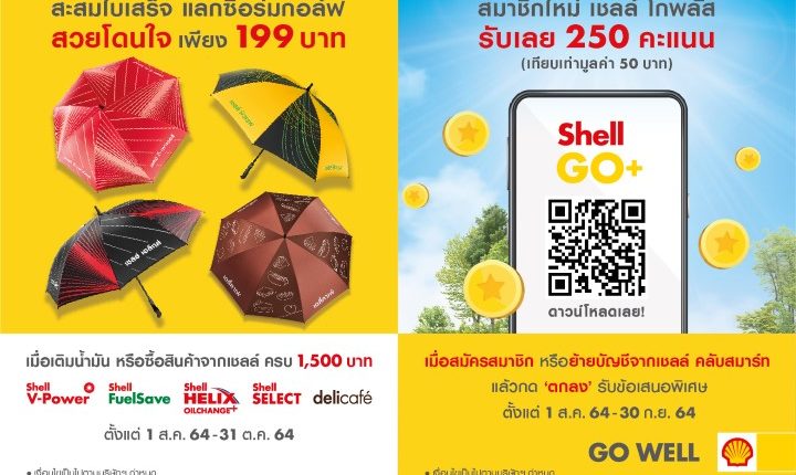 บริษัท เชลล์แห่งประเทศไทย จำกัด เดินหน้าเติมความสุขให้ทุกการเดินทาง ส่งโปรโมชันพิเศษให้ลูกค้าอุ่นใจไม่ว่าจะฝนตกหรือแดดออก เพียงสะสมใบเสร็จครบ 1,500 บาท จากการใช้จ่ายภายในสถานีบริการน้ำมันเชลล์ ไม่ว่าจะเป็นการเติมน้ำมันเชลล์ชนิดใดก็ได้ การซื้อหรือเปลี่ยนถ่ายน้ำมันเครื่องเชลล์ ซื้อสินค้า อาหาร หรือ เครื่องดื่มที่ร้านสะดวกซื้อเชลล์ซีเล็ค หรือร้านกาแฟเดลี่คาเฟ่ รับสิทธิแลกซื้อร่มกอล์ฟคอลเลคชันพิเศษ คุณภาพพรีเมียม กันรังสียูวี ขนาด 30 นิ้ว ที่มาพร้อมกับด้ามจับระบบกดออโต้ ในราคาเพียง 199 บาท (จากราคาปกติ 599 บาท) โดยมีให้เลือกสะสมถึง 4 ลาย ตั้งแต่วันที่ 1 สิงหาคม – 31 ตุลาคม 2564 หรือจนกว่าสินค้าจะหมด พร้อมจัดเต็มยิ่งกว่ากับข้อเสนอพิเศษ เมื่อสมัครสมาชิกใหม่ หรือย้ายบัญชีจากเชลล์ คลับสมาร์ท มายังเชลล์ โกพลัส (Shell GO+) และเลือกตกลงรับข้อเสนอพิเศษ รับคะแนนพิเศษทันที 250 คะแนน หรือเทียบเท่ามูลค่า 50 บาท เพื่อใช้เป็นส่วนลดน้ำมัน หรือซื้อของในร้านค้าเชลล์ที่ร่วมรายการ ตั้งแต่วันที่ 1 สิงหาคม – 31 กันยายน 2564