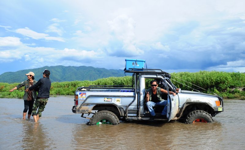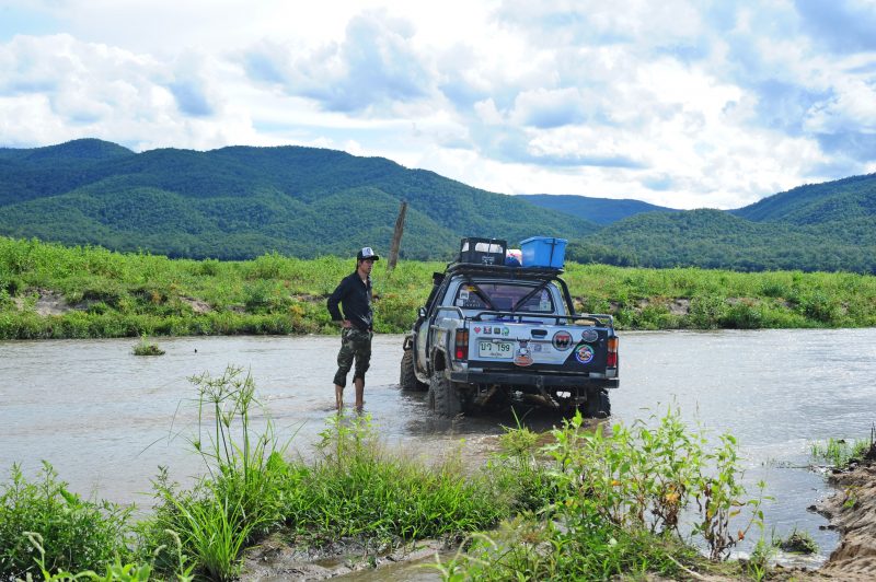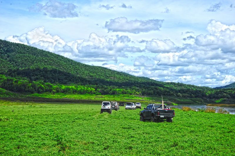ผมกะเอาลำน้ำปิงเป็นที่หมาย พอถึงริมฝั่งแม่น้ำก็ขับลงไปตามทุ่งหญ้าริมน้ำลงไปเรื่อย แล้วส่งวิทยุแจ้งไปยังลุงแดง ยอดดอย กับ อ.ต้อม ที่อยู่บนดอยเรือ ขับรถลงมาพบกันที่ตีนเนินดอยเกิ้ง เพื่อข้ามเนินเล็กเบื้องหน้ามุ่งสู่ที่หมาย สำหรับตั้งแค้มป์พักแรมทริปนี้ที่ สบน้ำแม่ลาย ที่อยู่ห่างจากดอยเรือไปประมาณสามสี่กิโลเมตร
