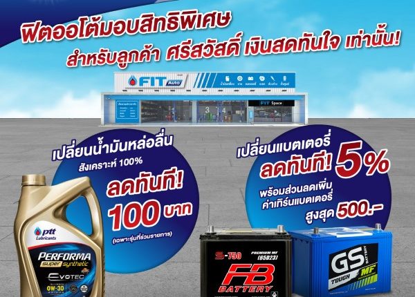 FIT Auto จับมือบริการศรีสวัสดิ์ เงินสดทันใจ ร่วมมอบสิทธิพิเศษสำหรับลูกค้าศรีสวัสดิ์ ให้ได้ฟิตรถกันสะดวกแถมคุ้มค่ามากขึ้น เมื่อมาใช้บริการศูนย์บริการยานยนต์ FIT Auto วันนี้ รับส่วนลดทันที 100 บาท สำหรับบริการเปลี่ยนน้ำมันหล่อลื่นสังเคราะห์ 100% (เฉพาะรุ่นที่ร่วมรายการ) และส่วนลดบริการเปลี่ยนแบตเตอรี่ 5% พร้อมส่วนลดค่าเทิร์นแบตเพิ่มสูงสุด 500 บาท สำหรับแบตเตอรี่ทุกรุ่น ตั้งแต่วันนี้–30 กันยายน 2564 ที่ FIT Auto ทุกสาขาทั่วประเทศ โดยเงื่อนไขโปรโมชั่นเป็นไปตามที่บริษัทฯกำหนด