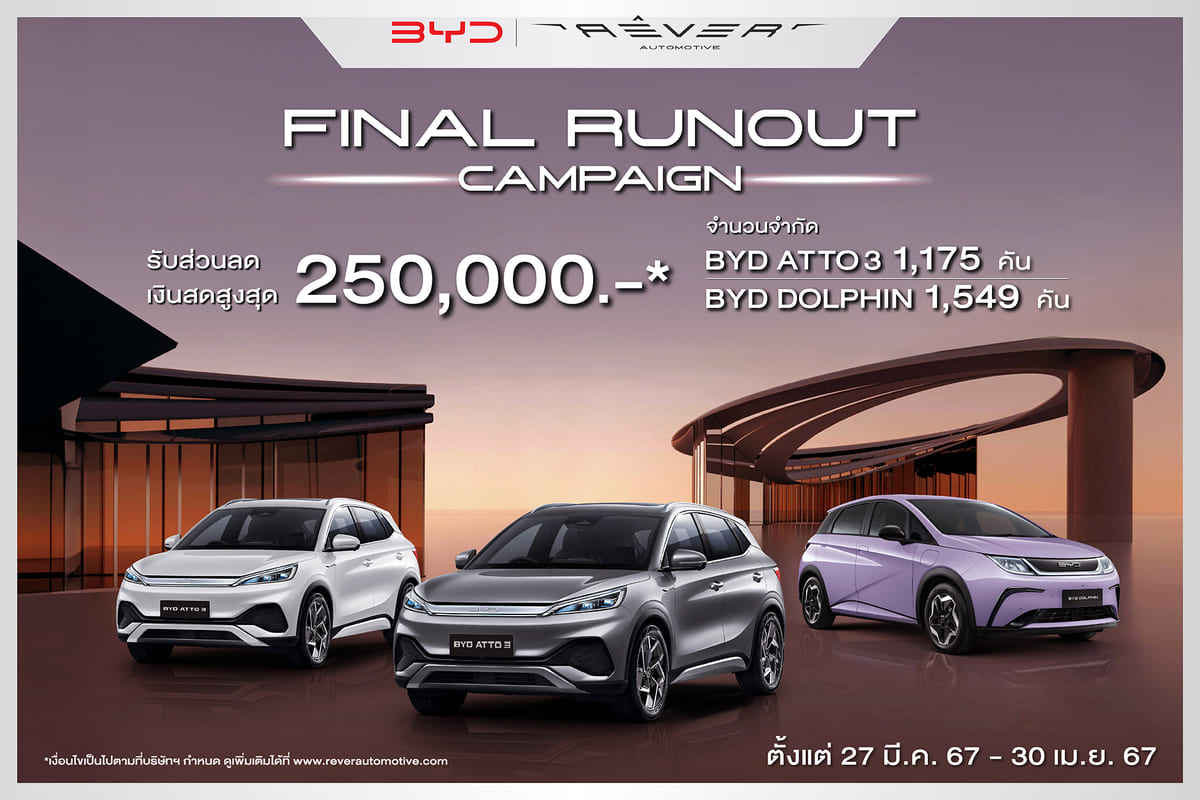 เรเว่ ออโตโมทีฟ มอบข้อเสนอสุดเอ็กซ์คลูซีฟสำหรับลูกค้าและผู้ที่สนใจซื้อรถยนต์ไฟฟ้า BYD ATTO 3 รุ่นปี 2023 (จำนวนจำกัด 1,175 คัน) และ BYD DOLPHIN (จำนวนจำกัด 1,549 คัน) รับส่วนลดเงินสดสูงสุด 250,000 บาท ตั้งแต่วันที่ 27 มีนาคม พ.ศ. 2567 – 30 เมษายน พ.ศ. 2567 โดยมีรายละเอียดดังนี้