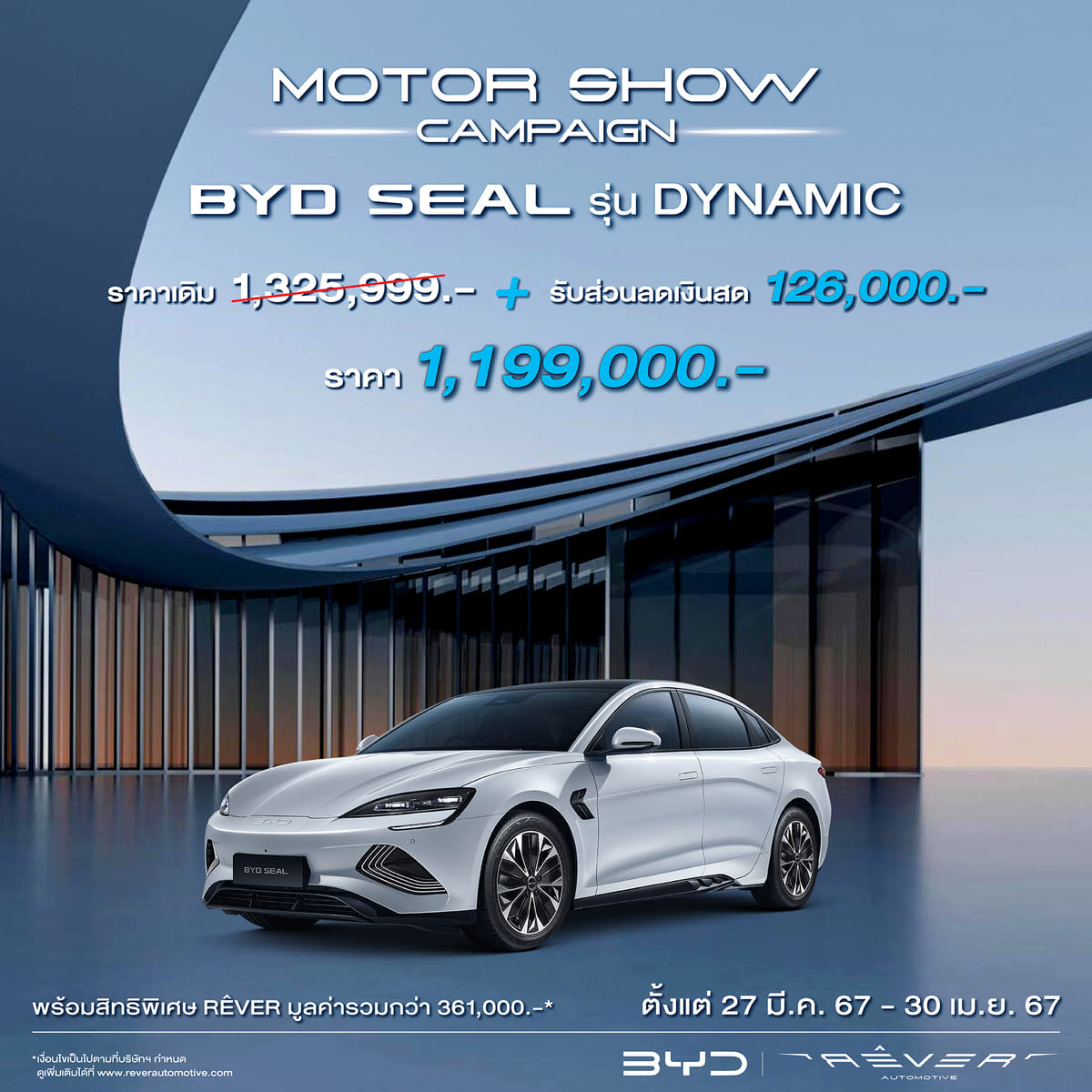 เรเว่ ออโตโมทีฟ จัดเต็มโปรโมชันต้อนรับงานมอเตอร์โชว์ สำหรับลูกค้าที่ซื้อ BYD SEAL ทุกรุ่น ตั้งแต่วันที่ 27 มีนาคม พ.ศ. 2567 – 30 เมษายน พ.ศ. 2567 (แคมเปญมีผลย้อนหลังเริ่มตั้งแต่วันที่ 1 มกราคม พ.ศ. 2567) โดยมีรายละเอียดดังนี้