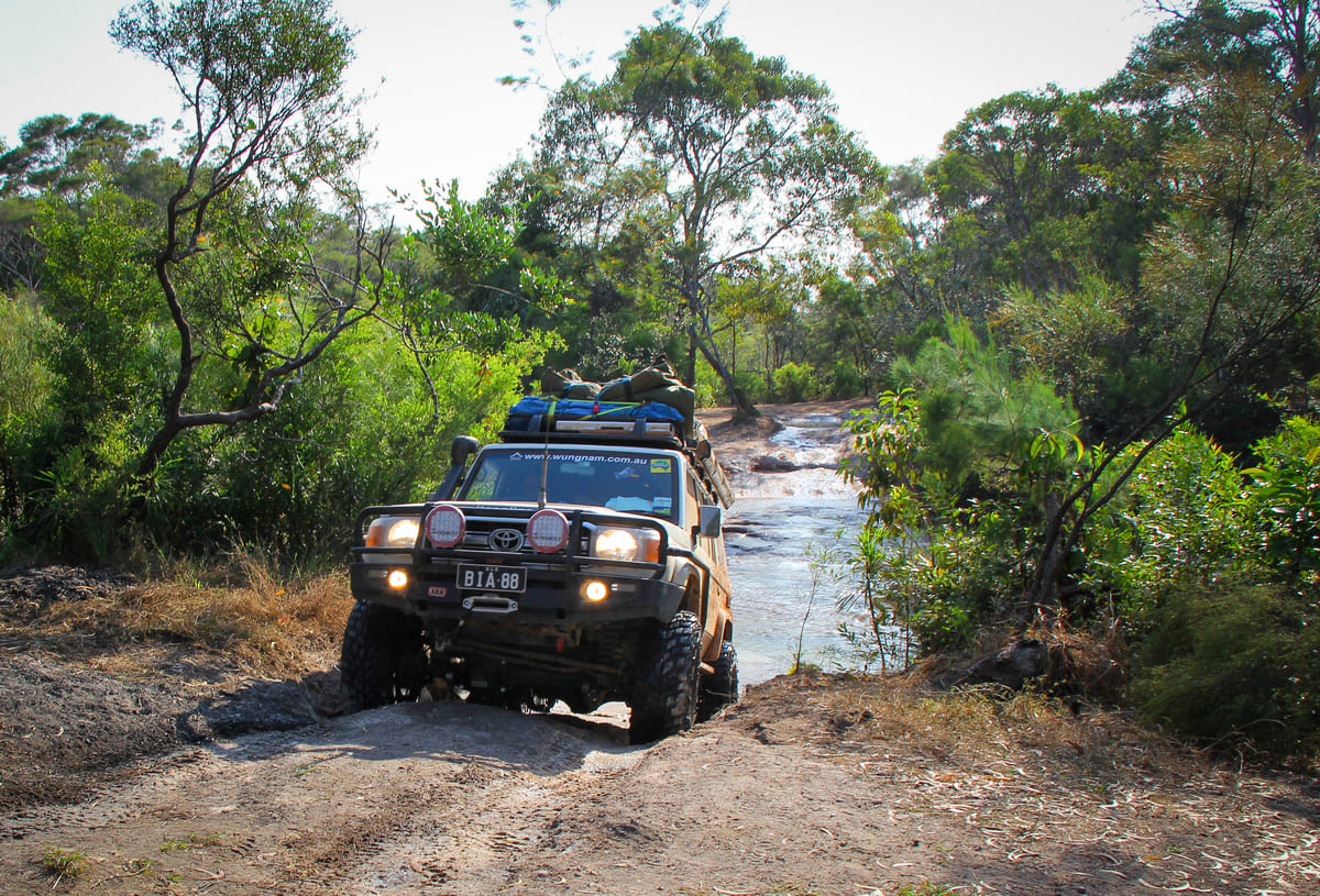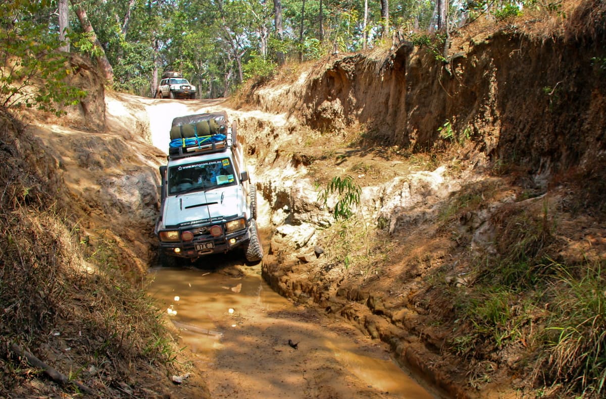 วันที่หกเราย้อนกลับออกมาทางเดิมพอถึง YAM CREEK (CREEK=ลำน้ำ คลอง ห้วย) มีทางแยกขวามือเป็นเส้นทางออฟโรดชื่อ FRENCHMAN TRACK มีหลายรสชาติ เช่น ทรายละเอียดร่วน ทรายดูด เนินสลับ ข้ามแม่น้ำ สะพานซุง ถ้ามือใหม่ก็ยากพอควร มาโผล่อีกทีที่ MORETON TELEGRAPH STATION ขับรถมาสักหนึ่งชั่วโมงก็ถึง BRAMWELL JUNCTION ตรงจุดทางแยกนี้มีผู้ร่วมเดินทางทำป้ายทะเบียนรถหายและผู้ที่เก็บได้นำมาติดไว้กับต้นไม้ เราขับรถต่อมุ่งหน้าสู่ THE OLD TELEGRAPH TRACK เส้นทางดั้งเดิมในการเดินทางสู่ THE TIP ที่นี่มีเส้นทางยากระดับ 3-4 ให้เล่นตลอดทาง ด่านแรก คือ PARM CREEK, DUCIE CREEK ทิ้งดิ่งข้ามลำน้ำและเชิดหัวขึ้นแบบเห็นแต่ท้องฟ้า GUN SHOT CREEK ทิ้งดิ่ง 70 องศา น่าหวาดเสียวถึงสันหลัง จุดนี้เราได้นำธงชาติไทยไปประดับร่วมกับธงชาติอื่นด้วย วันนี้เราผ่านจุดออฟโรดหนักๆ หลายที่ แต่ยังไม่พ้นแนวป่า แต่ก็ได้ที่พักดีพอสมควรที่ ELIOT/TWIN/INDIAN HEAD FALLS ติดน้ำตก มีห้องน้ำและน้ำสะอาดให้ใช้