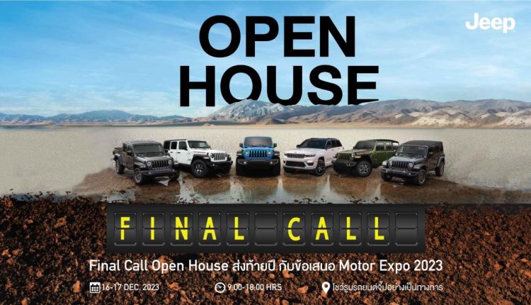 จี๊ป ประเทศไทย ผู้นำเข้าและจัดจำหน่ายรถยนต์ จี๊ป ราชาออฟ-โรดสัญชาติอเมริกัน อย่างเป็นทางการ ในประเทศไทย จัดกิจกรรมพิเศษ ‘Jeep Final Call Open House’ ชวนผู้หลงใหลยอดรถยนต์ สายพันธุ์แกร่ง สัมผัสและทดลองขับรุ่นที่ใช่ พร้อมมอบความคุ้มค่าส่งท้ายปี จองสิทธิ์ซื้อและออกรถวันนี้ รับข้อเสนอเดียวกับ มอเตอร์ เอ็กซ์โป 2023 และอีกมากมาย