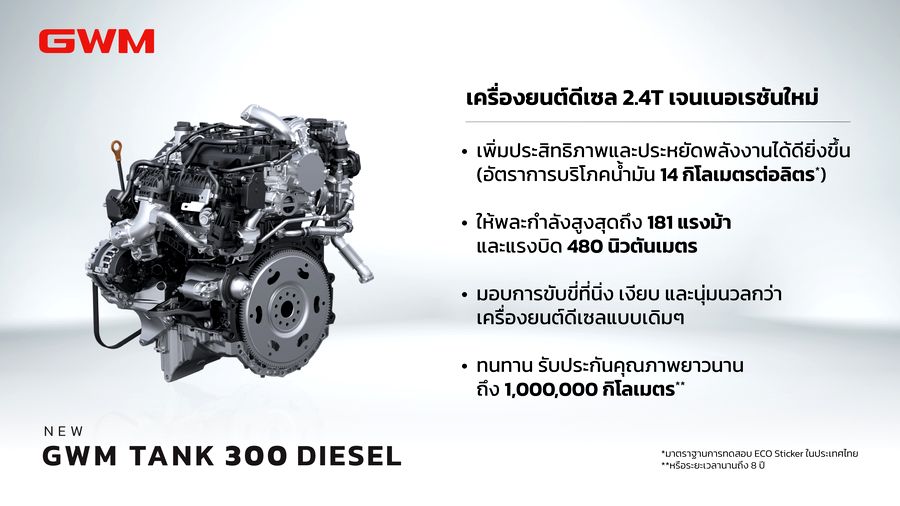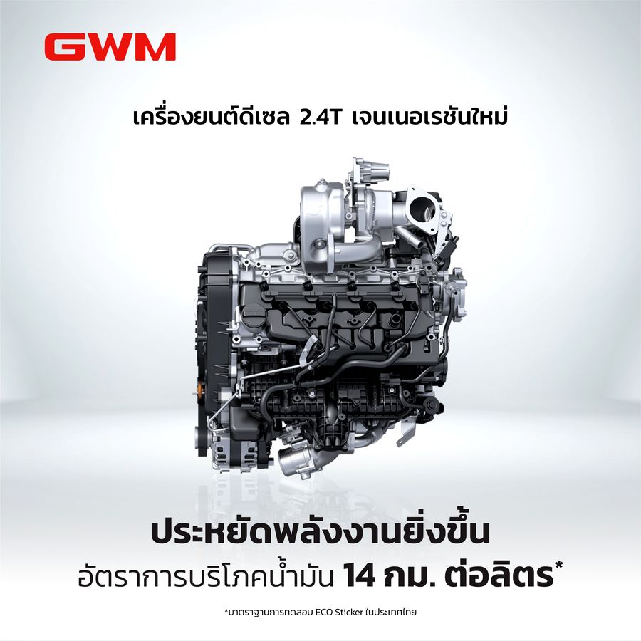 สำหรับเครื่องยนต์ดีเซล 2.4T เจนเนอเรชันใหม่ล่าสุด มี 4 จุดเด่นสำคัญที่จะยกระดับทุกประสบการณ์การขับขี่ให้ดียิ่งกว่าเครื่องยนต์ดีเซลแบบเดิม ๆ ได้แก่ การประหยัดพลังงานที่ดีมากขึ้น ฉีกกฏเครื่องยนต์ดีเซลทั่วไป ให้ประสบการณ์การขับขี่ที่นิ่ง เงียบ และนุ่มนวลกว่าเคย ประสิทธิภาพการขับขี่ที่สูงขึ้น และการรับประกันคุณภาพที่ยาวนานขึ้น โดยในประเทศจีนได้นำร่องเปิดตัวเครื่องยนต์ดีเซล 2.4T เจนใหม่นี้ ในรถยนต์ 2 แบรนด์ผลิตภัณฑ์อย่าง GWM TANK และ GWM POER เป็นที่เรียบร้อยแล้ว และเร็ว ๆ นี้ GWM (Thailand) เตรียมนำ NEW GWM TANK 300 DIESEL ที่มาพร้อมเครื่องยนต์ดีเซล 2.4T เจนเนอเรชันใหม่นี้ ให้ชาวไทยได้สัมผัสกับขุมพลังดีเซลอันทรงประสิทธิภาพ ผสานความหล่อ เท่ ให้โดดเด่น ครบเครื่องในทุกเส้นทาง เพื่อการใช้งานในชีวิตประจำวัน ที่หลากหลายทั้งในเมืองหรือนอกเมือง ออนโรดและออฟโรด
