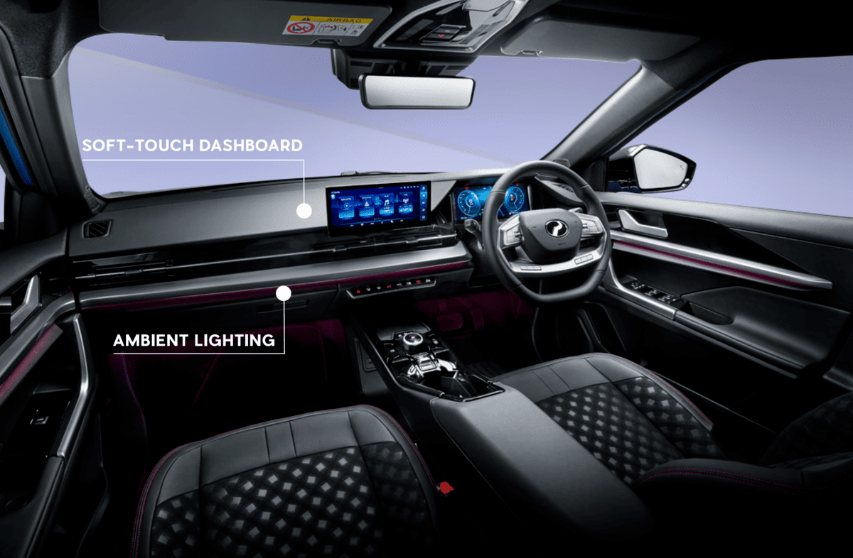 ห้องโดยสารของรถที่เน้นความเรียบของแผงแดชบอร์ดมีทั้งจอแสดงข้อมูลการขับและจอ Infotainment ขนาด 10.25 นิ้วเท่ากัน โดยรองรับ Android Auto และ Apple CarPlay ไร้สาย ขณะที่คอนโซลกลางถูกออกแบบให้มีลักษณะลอยตัว ส่วนอุปกรณ์อื่นๆ ในห้องโดยสารมีเบาะหุ้มหนังกึ่งสังเคราะห์ โดยเบาะผู้ขับปรับไฟฟ้า 6 ทิศทาง ไฟ Ambient Lighting 7 สี เบาะหลังแบ่งพับได้ 60/40 และช่องต่อยูเอสบี