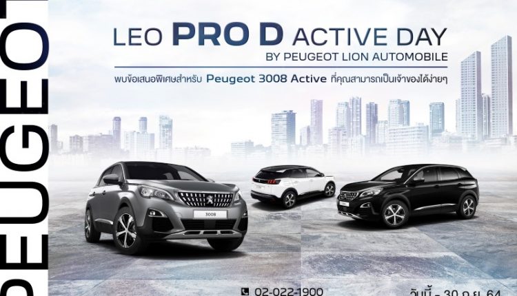 เปอโยต์ ไลอ้อน ออโตโมบิล (ประเทศไทย) ผู้แทนจำหน่ายรถยนต์เปอโยต์ อย่างเป็นทางการในประเทศไทย เปิดโอกาสให้ลูกค้าได้จับจองรถยนต์เปอโยต์ 3008 Active ที่มาพร้อมข้อเสนอสุดพิเศษภายในงาน ‘LEO PRO D ACTIVE DAY’ วันนี้ ถึงสิ้นเดือนกันยายน 2564 ที่โชว์รูมเปอโยต์ ไลอ้อน ออโตโมบิล ทุกสาขา