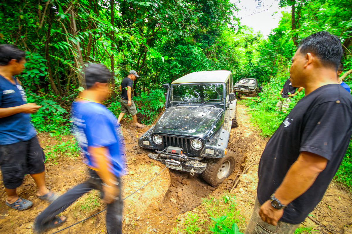 ตอนนี้ก็เดินทางมาประมาณ 8 ก.ม แล้ว พอมาถึง ก.ม.ที่ 10 พวกเราก็มาเจอล่องตัวเอสสลับ คันแรกกนกผ่านไปได้รวมทั้ง หมู OB ชาติ จ๋าและเอนก ก็ผ่านเช่นกัน ส่วน สันติชัย ต้องใช้วิ้นช์ช่วย บังและช่างมอใช้ทางเบี่ยงซ้าย เราขับกันต่อแต่เราหาทางไม่เจอ ต้นไม้ขึ้นรกมาก พวกเราจะข้ามเขาไปลงอีกฝั่งหนึ่งคือบ้านด่านจันทร์ แต่ก็หาทางไม่เจอตอนนี้ก็เวลาบ่ายสองโมงแล้ว เราตกลงกันว่าจะกลับทางเดิม แต่ตอนนี้ทุกคนก็หิวแล้วก็เลยต้มมาม่าหม้อใหญ่รองท้องกัน