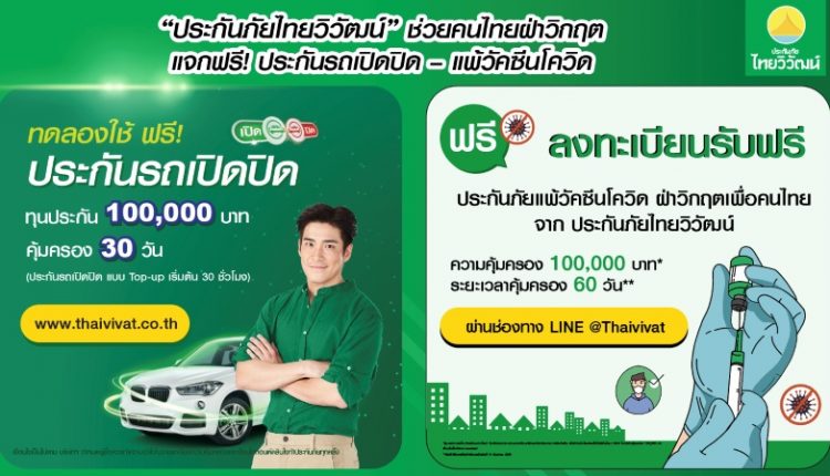 ประกันภัยไทยวิวัฒน์ ช่วยบรรเทาผลกระทบโควิด-19 เปิดให้ผู้ใช้รถยนต์ทดลองใช้ “ประกันรถเปิดปิด” ฟรี! สูงสุด 30 วัน พร้อมแจกประกันแพ้วัคซีนโควิด 500,000 สิทธิ์ ลงทะเบียนรับกรมธรรม์ผ่าน LINE Official Account ID: @Thaivivat ตั้งแต่วันนี้-30 มิถุนายน 2564 หรือจนกว่าสิทธิ์จะครบจำนวน