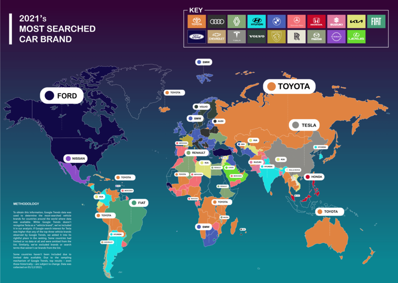 ดูเหมือนว่าปี 2021 ที่ผ่านมาจะเป็นปีแห่งความสำหรับของ Toyota เพราะนอกจากจะแซงหน้า GM ขึ้นแท่นเป็นผู้ขายรถยนต์มากที่สุดในสหรัฐอเมริกาแล้ว ยังเป็นผู้ผลิตรถยนต์ที่ถูกค้นหาในกูเกิลมากที่สุดในโลกจากการรวมรวมข้อมูลในกูเกิลเทรนด์โดย Compare the Market